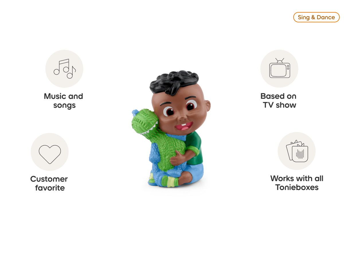Get ready to enjoy a musical collection of favorite Cody songs from the wonderful world of CoComelon. This Tonie features songs about dinosaurs. family. and everyday routines with silly rhymes and catchy beats. Perfect for CoComelon fans who love to dance and sing along!
