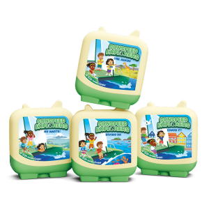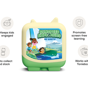 Sunspeed Explorers is a fun. educational series about three eco-conscious friends. Raj. Aya and Mia. who explore climate change using the RRR approach: Reduce. Reuse. Recycle. Your explorers need only pop this Clever Tonie on their Toniebox to start their sustainability adventure.